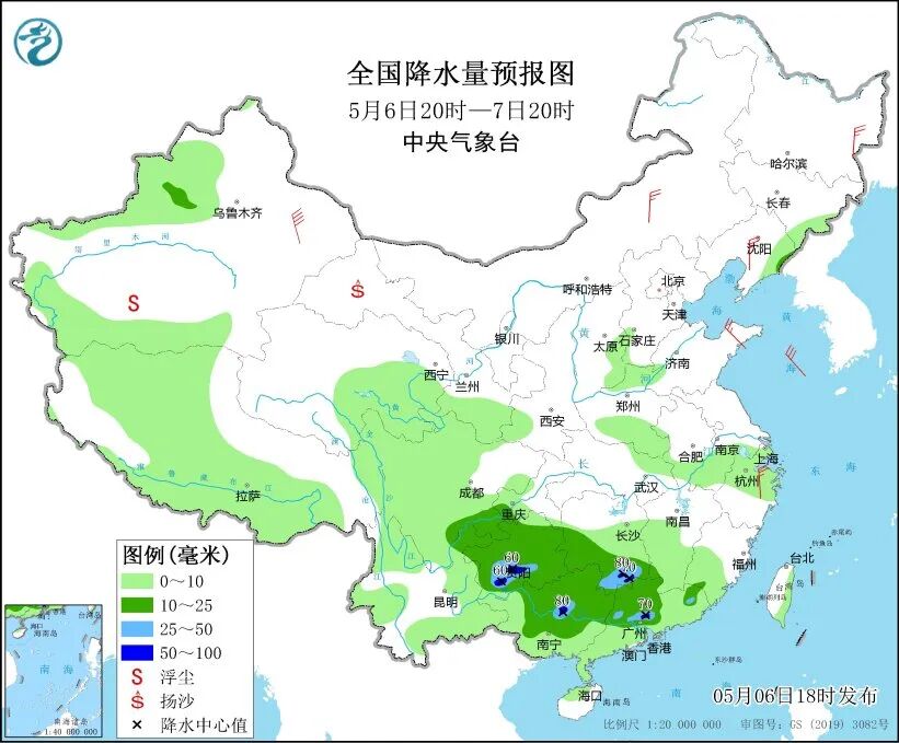 中央气象台预计,6日20时至7日20时,四川东南部、重庆、湖南南部、贵州大部、广西大部、广东西北部等地部分地区有中到大雨,其中,湖南南部、贵州南部、广西中部、广东中西部等地部分地区有暴雨。