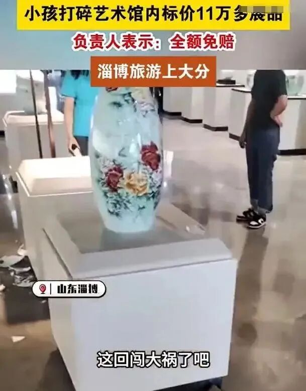 5月2日,山东淄博国艺馆文化艺术馆内,一小孩打碎了一个标价116000元的华光陶瓷花瓶,面对一地碎片,一家人不知所措。