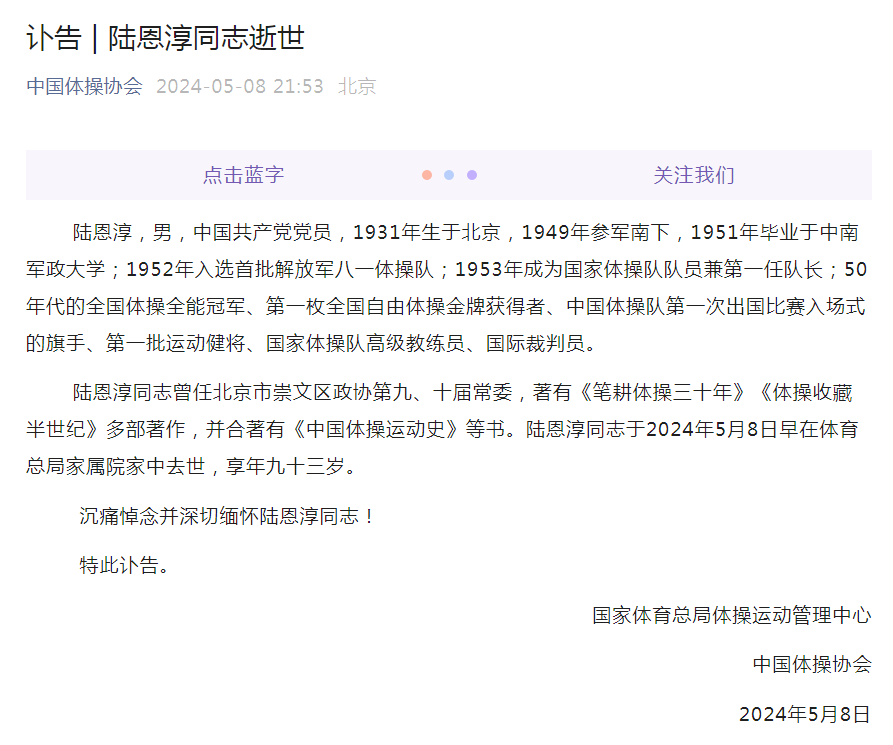 5月8日晚间,国家体育总局体操运动管理中心、中国体操协会发布讣告,国家体操队第一任队长陆恩淳于2024年5月8日早在体育总局家属院家中去世,享年九十三岁。