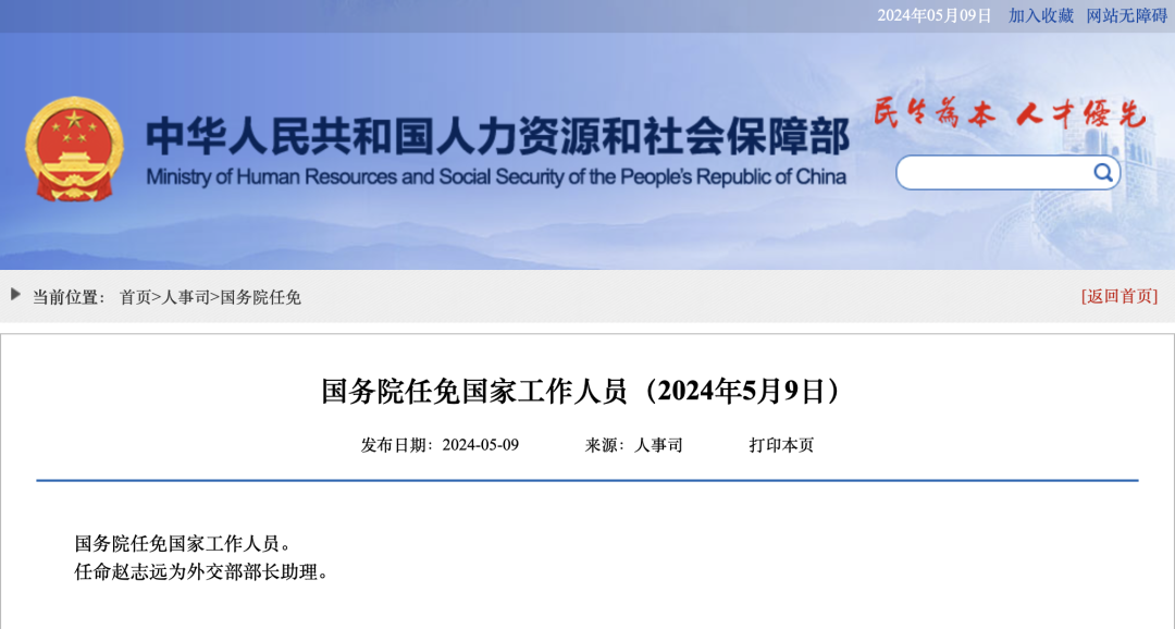 国务院任免国家工作人员。任命赵志远为外交部部长助理。