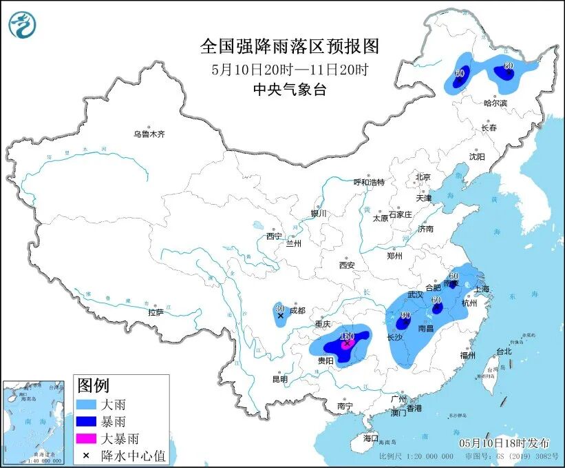 中央气象台10日18时继续发布暴雨蓝色预警和强对流天气蓝色预警:预计10日20时至11日20时,贵州中东部、湖南西部和东部、湖北东部、江西西部和北部、安徽南部、江苏南部、上海、浙江西部、四川盆地西南部以及内蒙古东北部、黑龙江中部等地的部分地区有大雨或暴雨,其中,贵州东北部、湖南西部局地有大暴雨。上述部分地区伴有短时强降水,部分地区将有8级以上雷暴大风或冰雹天气,其中,贵州中北部、湖南中西部等地局地将有10级以上雷暴大风,最大风力可达11级以上。