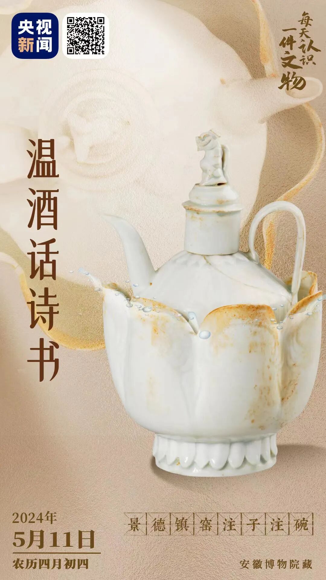 宋代景德镇窑注子注碗,由注碗、注子和盖三部分组成,通体青白釉,白中闪青、晶莹润泽,像是一朵出淤泥而不染的“莲花”。使用时,先用注子盛酒,再将注子放在注碗中,最后往注碗内加热水,用来温注子里盛的酒。