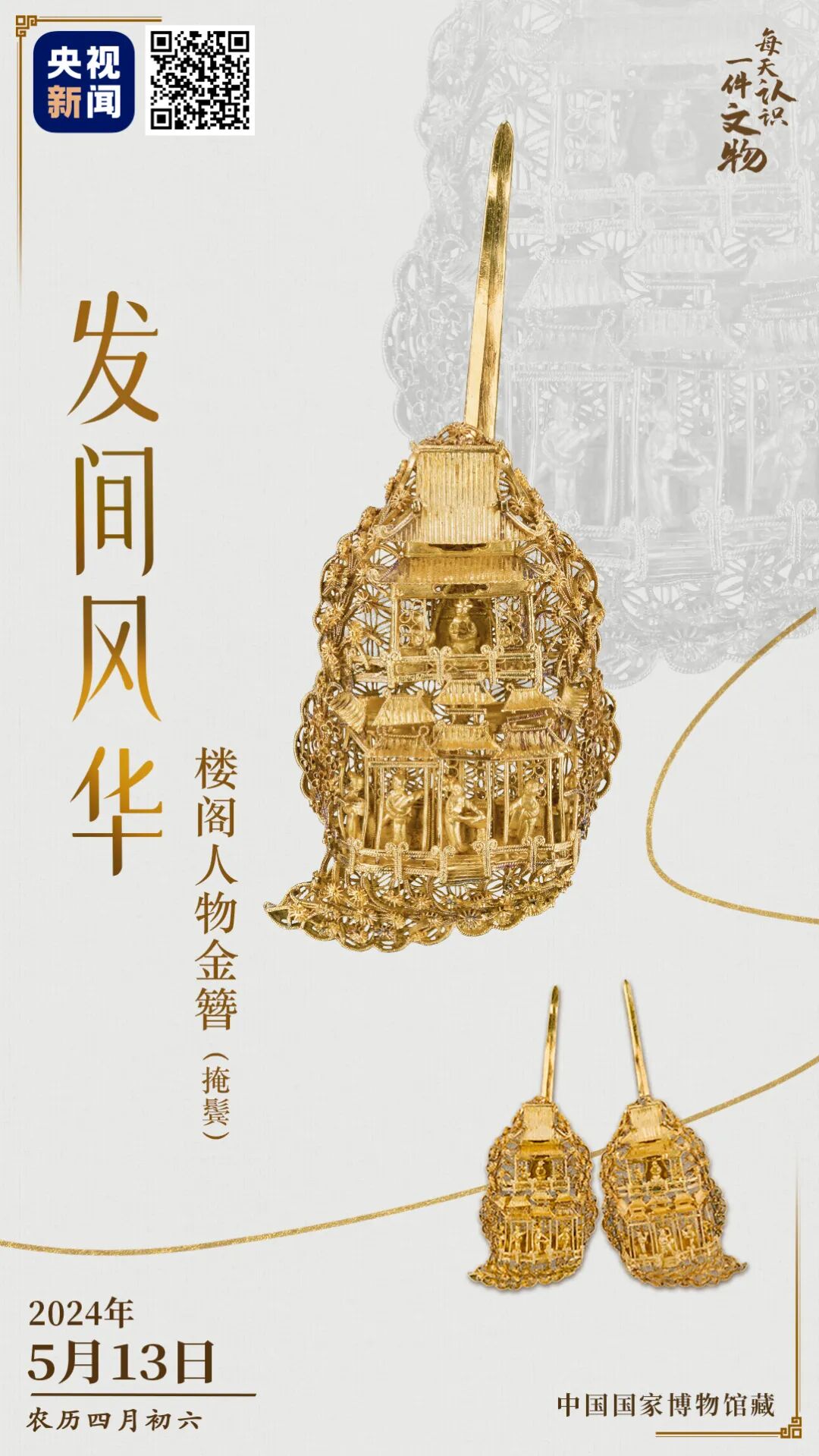 明楼阁人物金簪,是一种名为“掩鬓”的发簪,用以掩盖鬓角。样式为两层微缩阁楼,飞檐翘角、围栏窗棂,十分逼真;阁楼中的8位“住户”形态各异,栩栩如生。