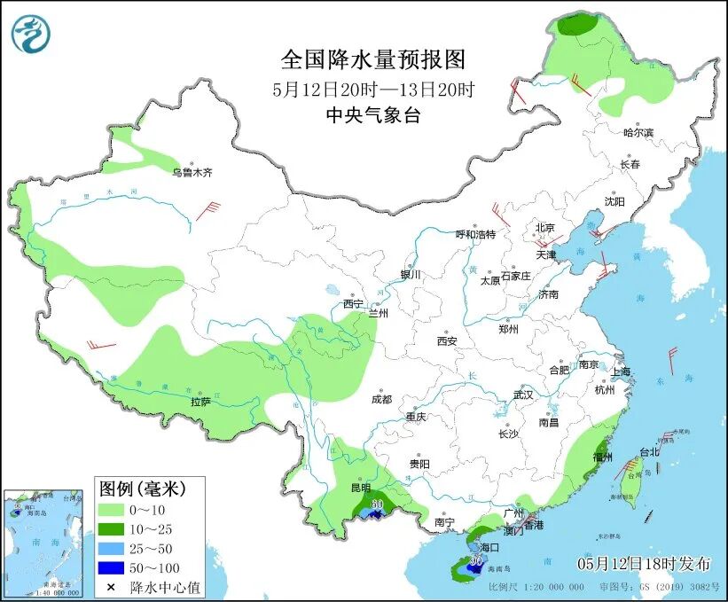 中央气象台预计,12日20时至13日20时,黑龙江西北部、福建东南部、云南东南部、广东西南部沿海、海南岛等地部分地区有中到大雨,其中,云南东南部、海南岛中东部等地部分地区有暴雨;西藏东部高海拔地区有雨夹雪。
