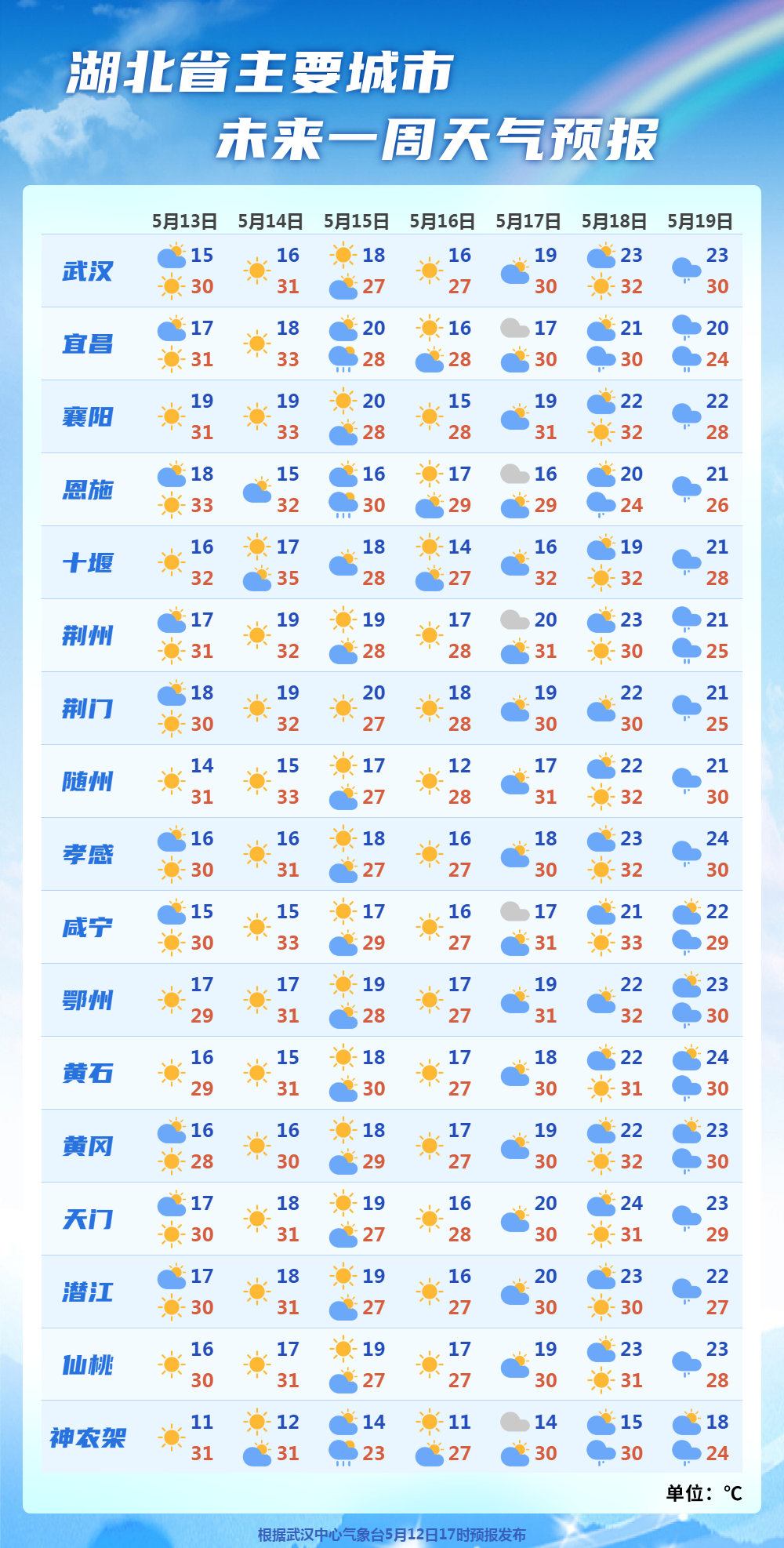 5月13日08时-14日08时,湖北晴天到多云。最高气温30~33℃,最低气温15~19℃,偏南风2到3级。