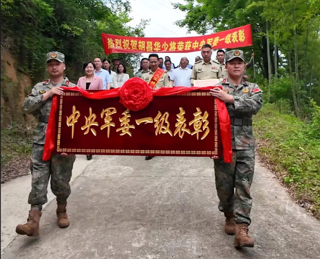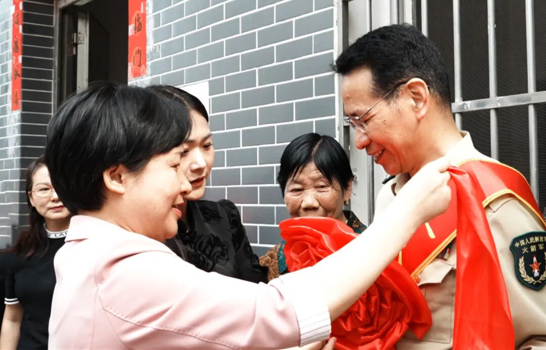 在送喜报活动中,火箭军工程大学相关负责人宣读了中央军委立功喜报,郝爱芳等领导为胡昌华及他的家属佩戴绶带、大红花。初夏的阳光下,“中央军委一级表彰”的牌匾熠熠生辉。