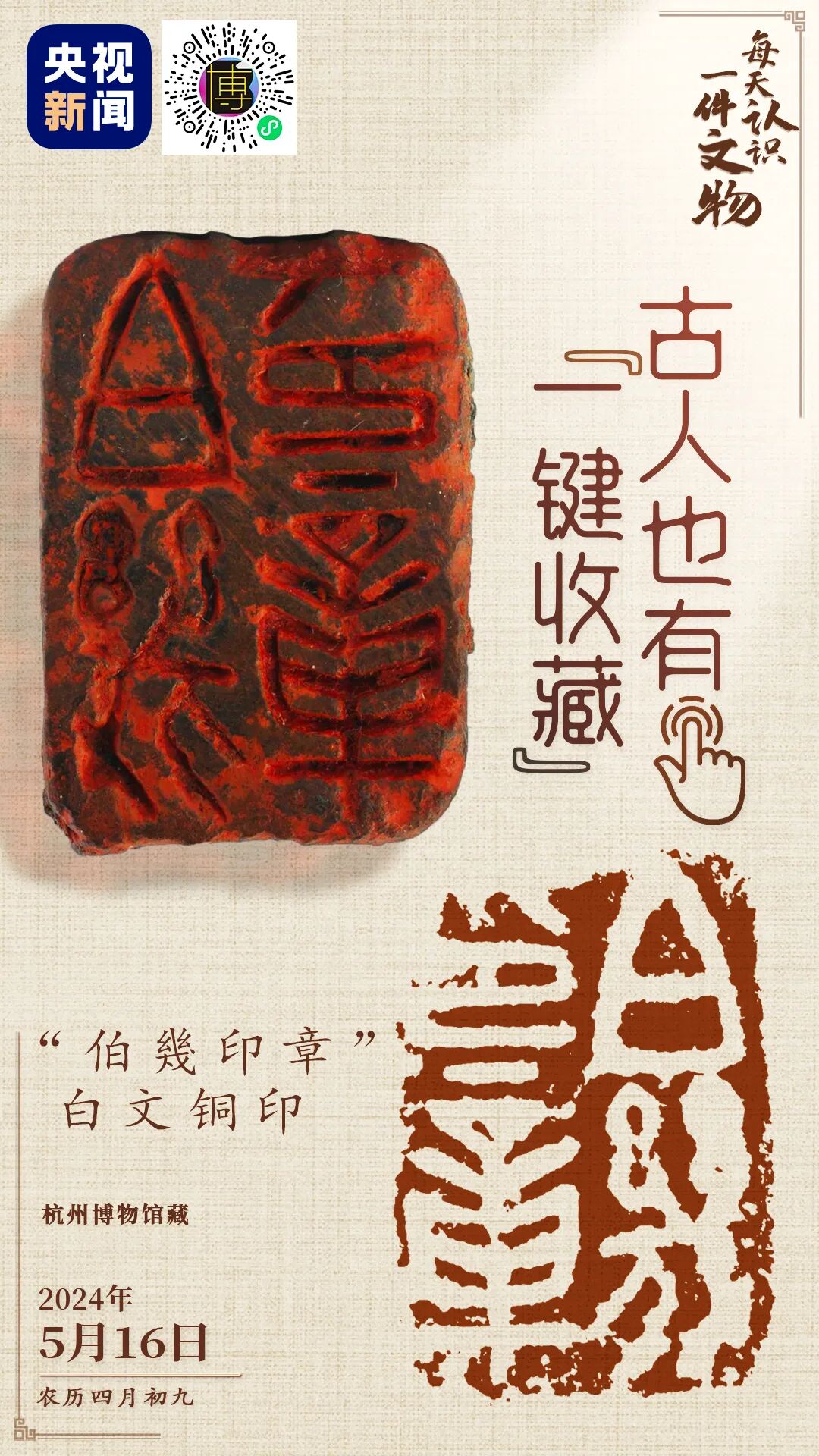 央视新闻联合全国博物馆推出文博科普产品《文博日历》,每天带你认识一件文物。现藏于杭州博物馆的“伯幾印章”白文铜印,是元代大书法家鲜于枢的生前常用印。这枚印章出土时,考古人员还在上面发现了残留的印泥。