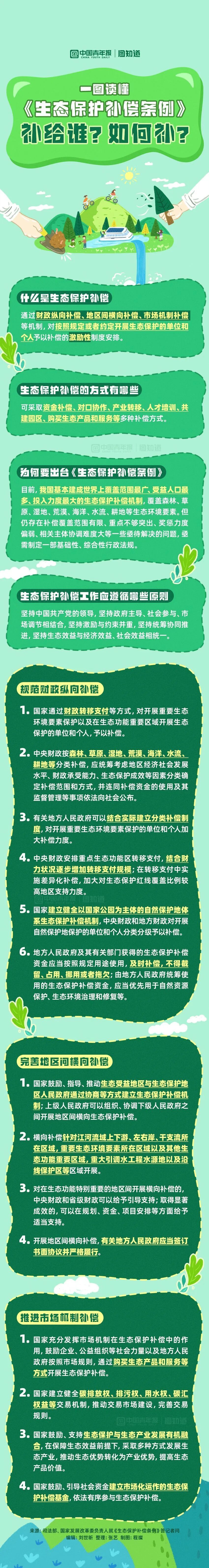 近日公布的 《生态保护补偿条例》 自2024年6月1日起施行 作为我国生态文明建设八项制度之一 的生态保护补偿 结束了没有系统立法的历史 如何理解生态保护补偿 由谁补给谁?怎么补? 一图了解↓ 来源丨中国青年报客户端