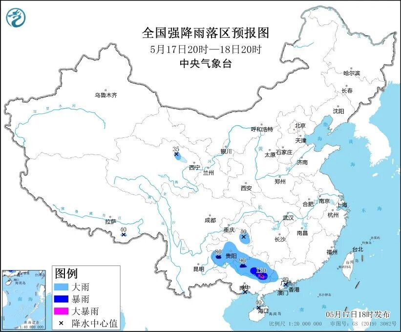 中央气象台17日18时发布暴雨蓝色预警:预计17日20时至18日20时,贵州东北部和西南部、广西中北部和南部、广东西部和南部沿海、海南岛北部等地部分地区有大到暴雨,其中,广西中部等地局地有大暴雨。上述部分地区伴有短时强降水,局地有雷暴大风等强对流天气。
