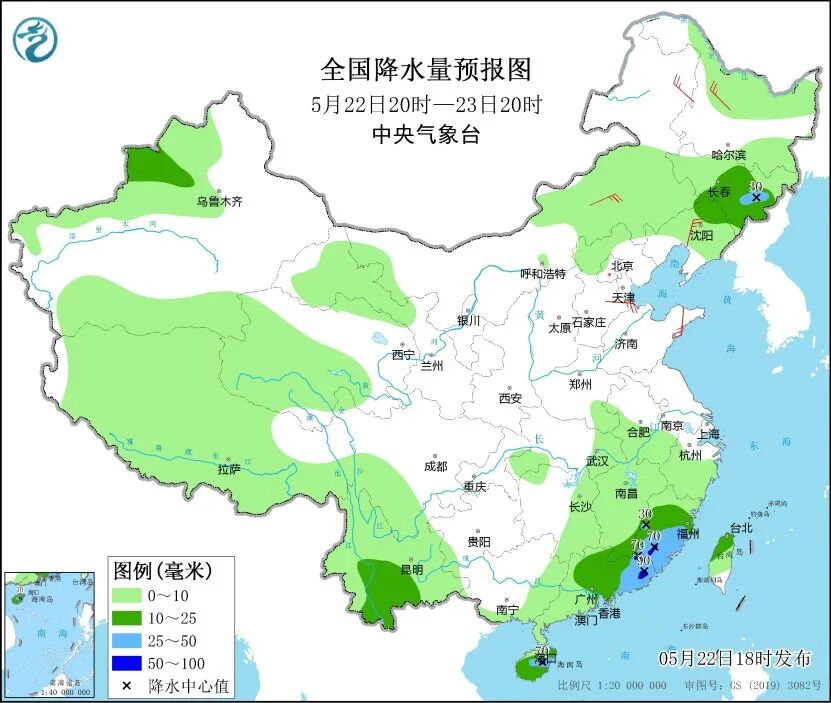 中央气象台预计,22日20时至23日20时,吉林中东部、辽宁北部、新疆伊犁河谷、云南南部、广东中东部、福建大部、江西南部、海南岛、台湾岛北部等地部分地区有中到大雨,其中,广东东北部、福建西南部、海南岛中东部等地部分地区有暴雨。