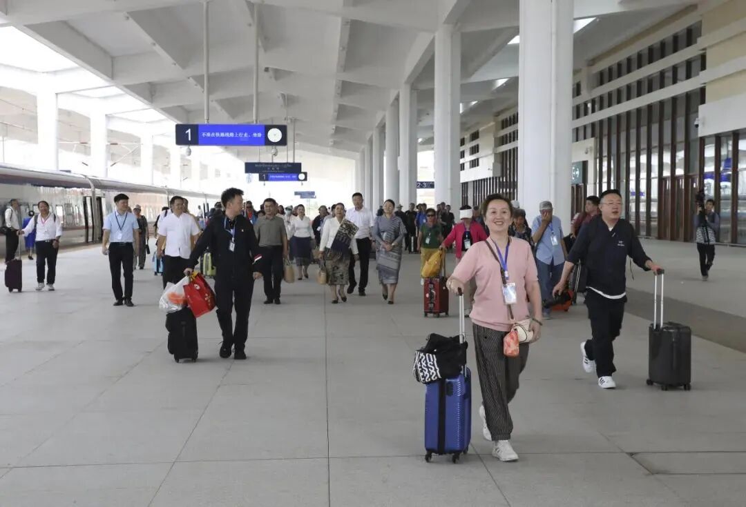 △5月9日,“多彩贵州号”旅游列车游客抵达中老铁路万象站。杜大鹏摄(新华社发)