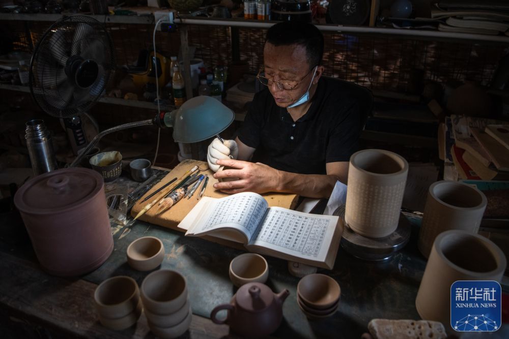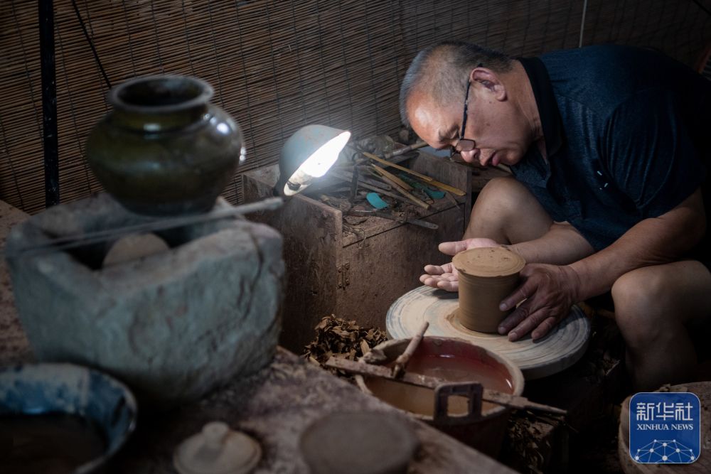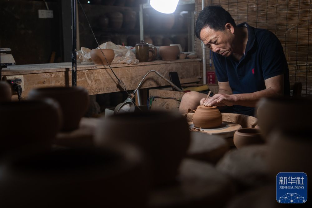 ↑5月25日,在管窑镇“柿外陶园”窑工小院,制陶工人在画坯。