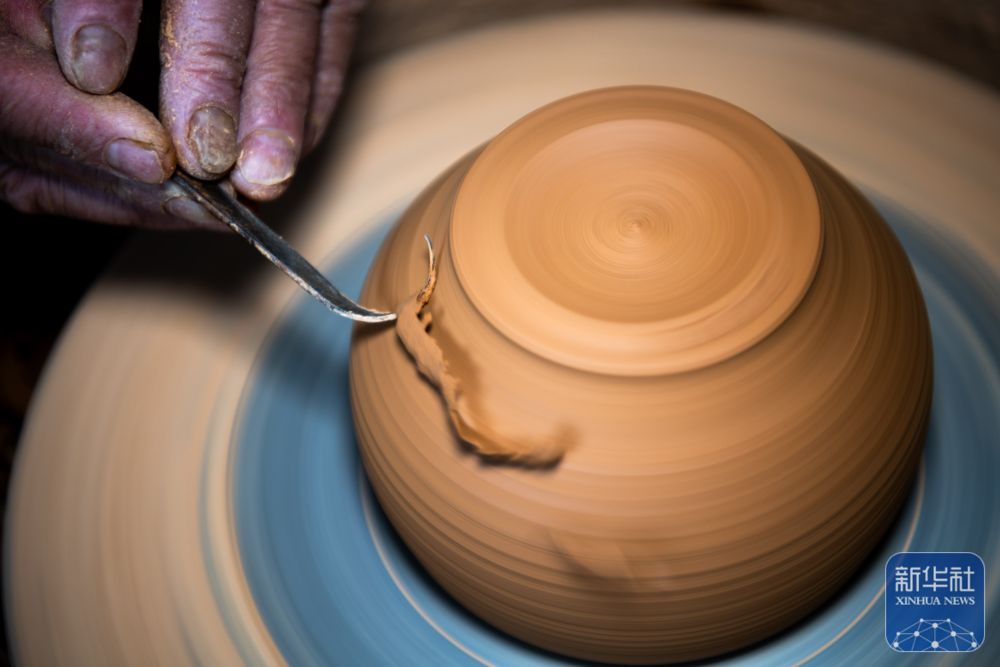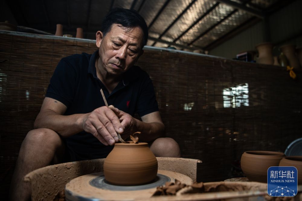 ↑5月25日,在管窑镇“柿外陶园”窑工小院,制陶工人在利坯。