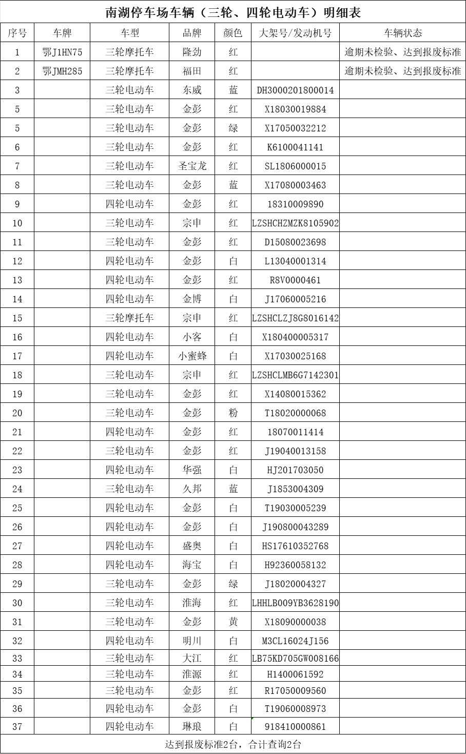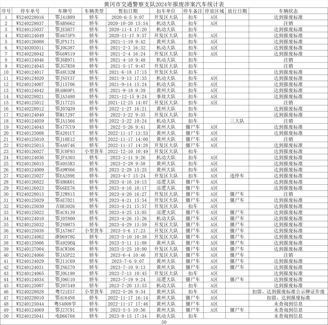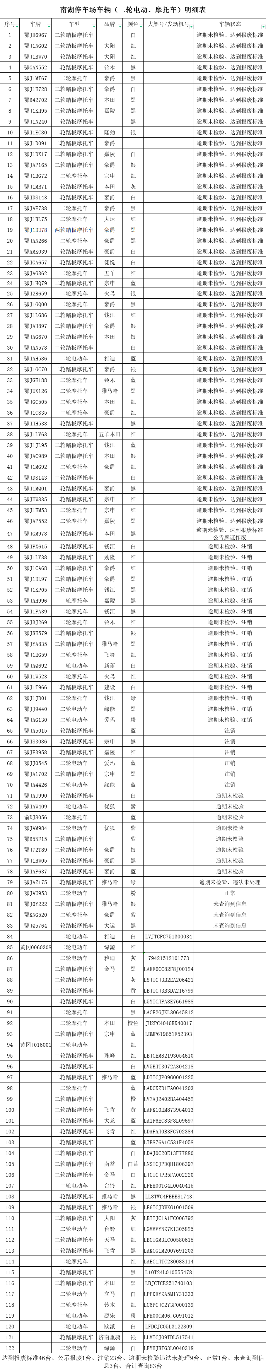 根据《机动车强制报废标准规定》第四条“已注册机动车有下列情形之一的应当强制报废……(四)在检验有效期届满后连续3个机动车检验周期内未取得机动车检验合格标志的。”及《机动车登记规定》第三十一条“已注册登记的机动车有下列情形之一的,车辆管理所应当公告机动车登记证书、号牌、行驶证作废:(一)达到国家强制报废标准,机动车所有人逾期不办理注销登记的;等相关法律规定,现将已达到强制报废标准机动车予以公告。自公告之日起,于90天后予以注销。同时该车辆行驶证、登记证书、号牌随之作废!