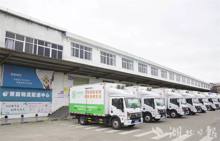 5月14日,黄州区宝塔大道黄商集团物流园。各类货车川流不息,将生鲜百货运往鄂东260家大小门店。