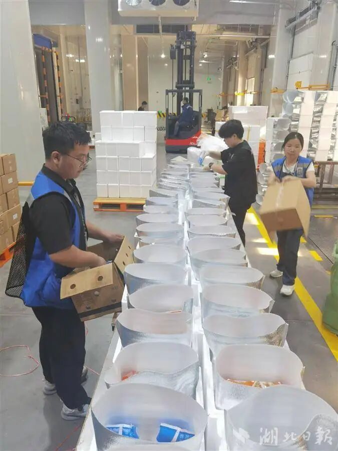 黄冈智慧冷链仓储物流园,工作人员正在打包发货。(湖北日报全媒记者 刘毅 摄)