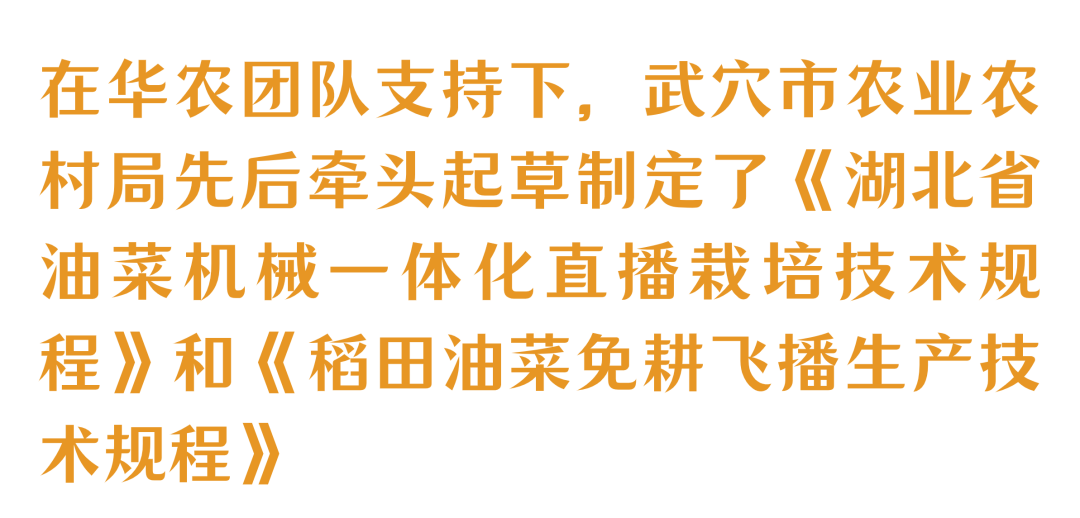 在华农团队支持下,武穴市农业农村局先后牵头起草制定了《湖北省油菜机械一体化直播栽培技术规程》和《稻田油菜免耕飞播生产技术规程》。其中《稻田油菜免耕飞播生产技术规程》于2022年获农业农村部批准发布为我国农业行业标准。