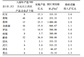 截至2012年底,黄冈11个县、市、区已初步建成农业产业化园区,且形成了一定的规模。有资料表明,入园年产值500万元以上的农产品企业以黄梅县、黄州区、龙感湖区、罗田县、蕲春县最多,其中又以黄州区、龙感湖区园区规划面积最大,分别为 1000、 666.67公顷。