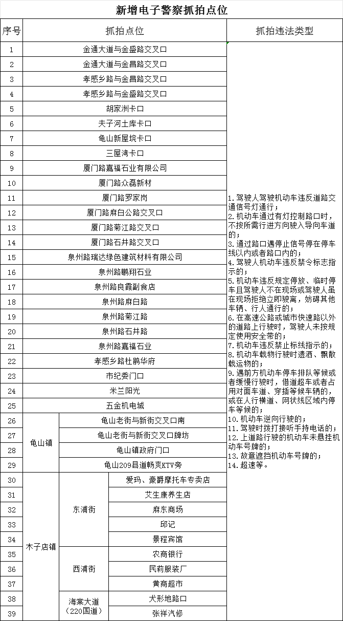 广大交通参与者:为预防和减少道路交通事故,保障道路交通安全畅通有序,根据《中华人民共和国道路交通安全法》等相关法律法规规定,自2024年6月11日起在麻城市部分路口、路段新增启用电子警察交通违法抓拍系统,对驾驶人及乘坐人员不系安全带、驾驶车辆时拨打接听电话、违反禁令标志指示、违反禁止标线指示、违反交通信号灯通行、不按所需行进方向驶入导向车道、逆向行驶、违反禁止标志停车等交通违法行为进行自动抓拍并依法处理。现将新增电子警察抓拍点位公示如下: