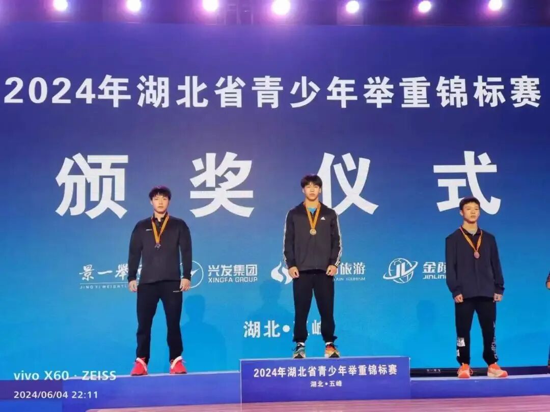 6月4日晚,黄州区业余体校、区思源学校运动员喻彪风在湖北省青少年举重锦标赛男子甲组67公斤级比赛中,以抓举120公斤、挺举145公斤、总成绩265公斤,取得该级别抓举第一、挺举第一、总成绩第一的好成绩,站上领奖台,收获3枚金牌。