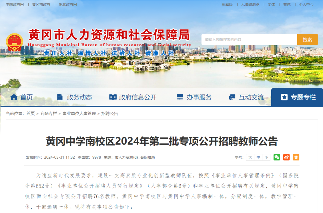 近日,市人社局、市教育局联合发布招聘公告,组织黄冈中学南校区专项公开招聘76名教师。