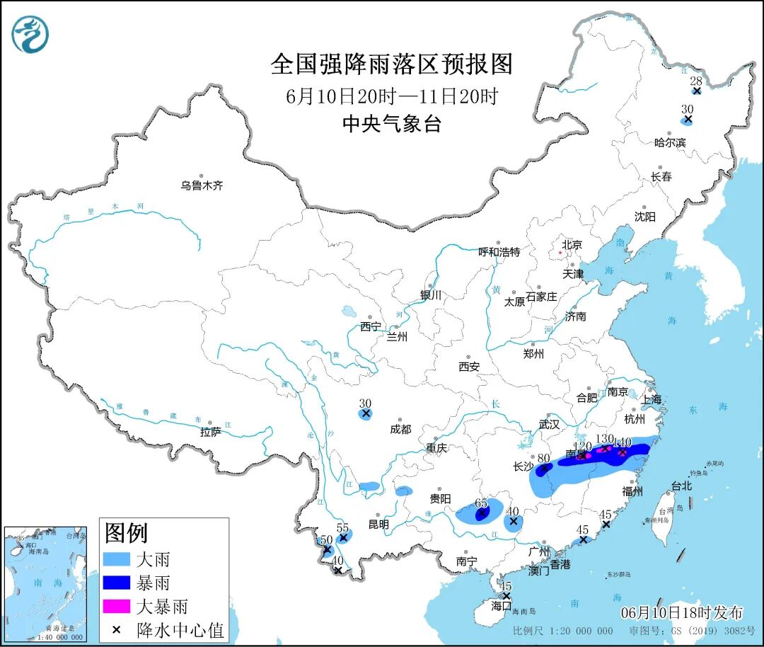 中央气象台10日18时发布暴雨蓝色预警:预计10日20时至11日20时,浙江、福建、江西、湖南、广西、云南等地部分地区有大到暴雨,其中,江西中北部、浙江西南部、福建西北部等地局地有大暴雨。上述部分地区伴有短时强降水,局地有雷暴大风等强对流天气。