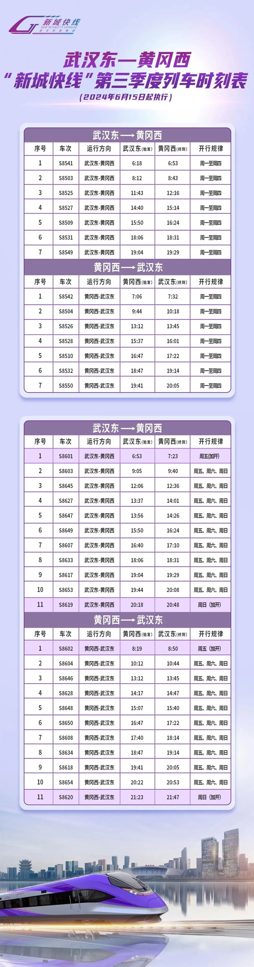 自6月15日零时起“新城快线”列车将按2024年第三季度最新列车运行图开行,列车时刻表如下。