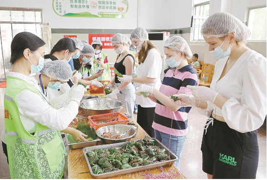近日,黄冈师范学院组织留学生在食堂学习包粽子。大家调糯米、缠彩线、包粽子,沉浸式体验中国端午民俗,感受中华传统节日的味道。
