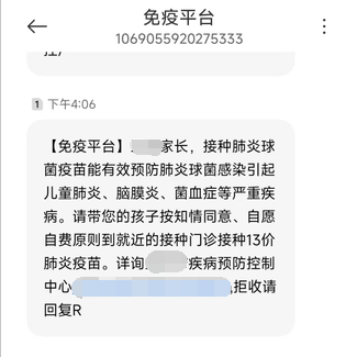 最近不少家长收到短信提醒:“XX家长,接种肺炎球菌疫苗能有效预防肺炎球菌感染引起儿童肺炎、脑膜炎、菌血症等严重疾病。请带您的孩子按知情同意、自愿自费原则到就近的接种门诊接种13价肺炎疫苗。详询XXX疾控中心,电话XXX,拒收请回复R。”