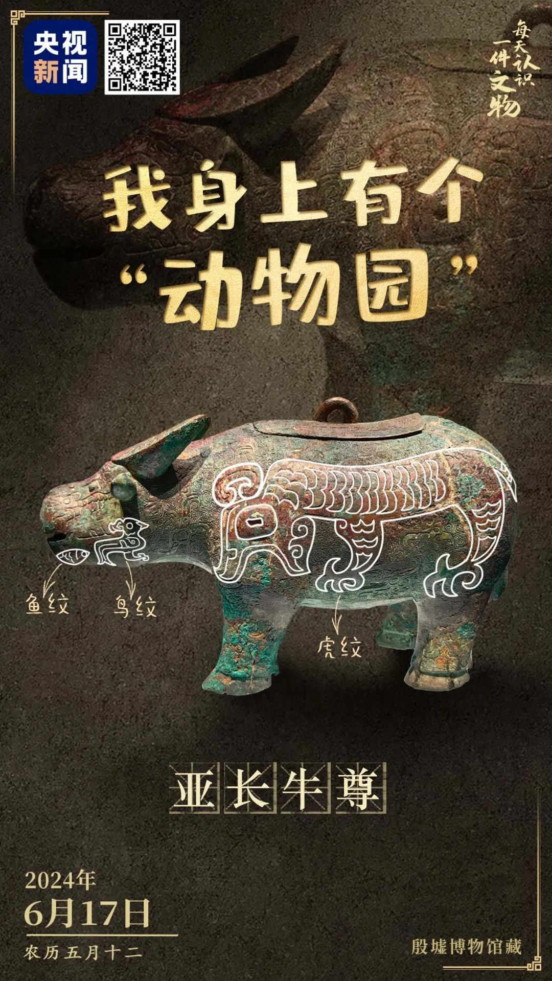 亚长牛尊出土自亚长墓,原型是商代的野生水牛——圣水牛,其周身布满20多种动物纹饰,是迄今为止殷墟发现的唯一一件牛形青铜器。