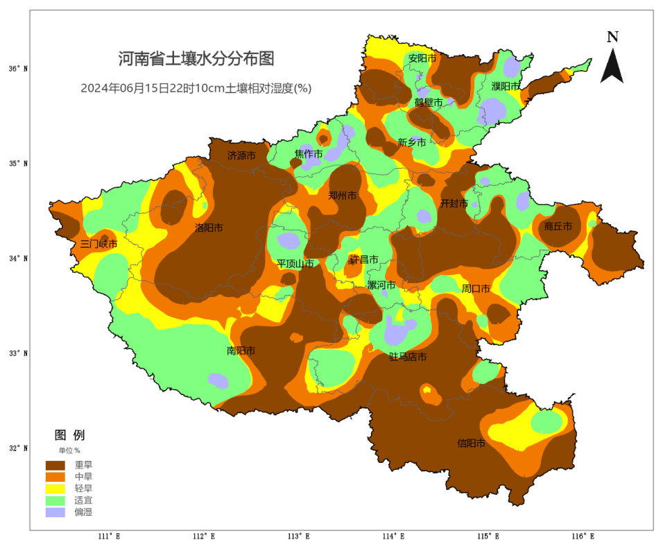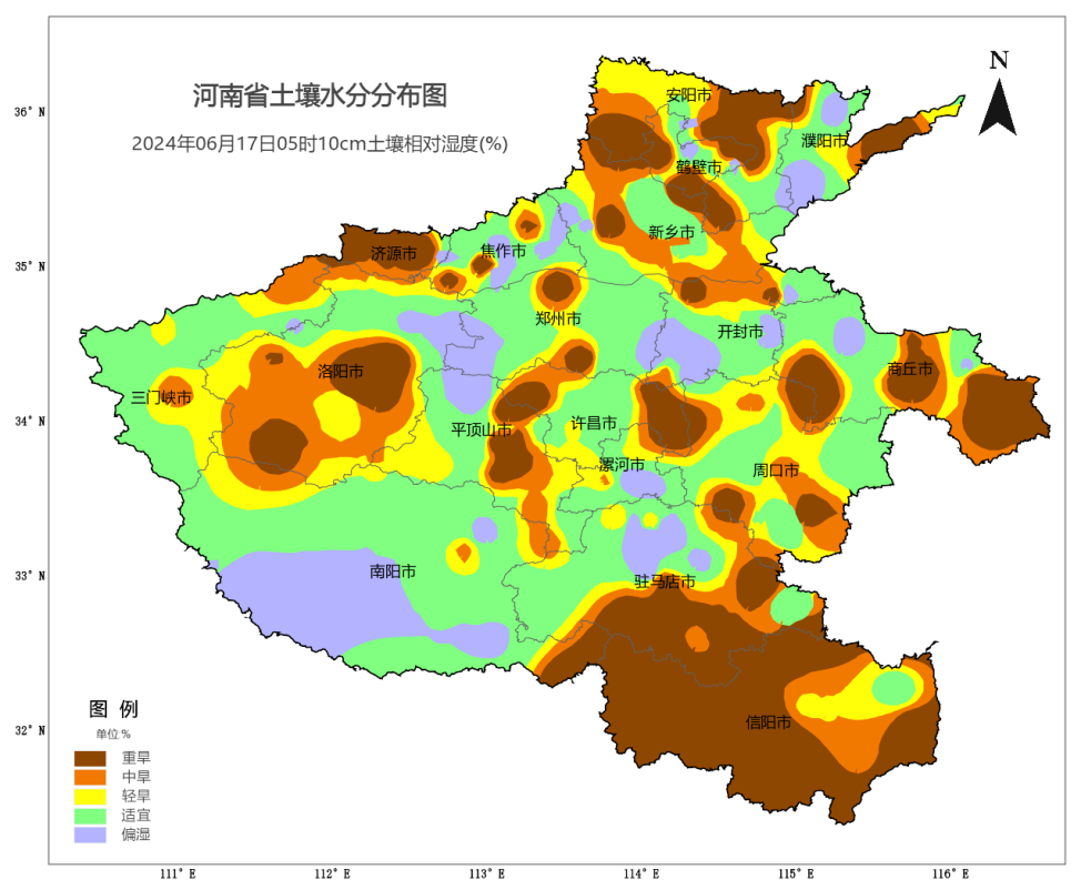 本轮降水后河南黄淮之间大部地区的土壤表层缺墒状况得到明显改善。据6月17日5时自动土壤水分监测资料显示,郑州、南阳、开封等地局部地块的土壤底墒明显增加,与15日22时相比,干旱测站比例下降15个百分点,其中重旱测站比例下降14个百分点。郑州、南阳、漯河、开封、三门峡、许昌、周口、洛阳、平顶山、商丘、驻马店等11个地市土壤墒情得到明显改善。但由于降水分布不均,河南仍有49%的测站缺墒,主要分布在三门峡西部、洛阳西部、商丘东部、驻马店南部、信阳和安阳等地。建议各地抓住有利时机,尽快组织抢墒抢种。