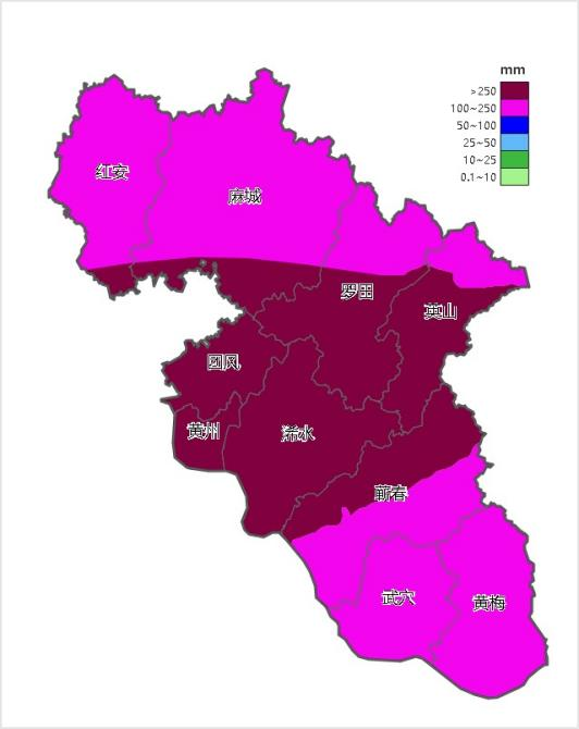 6月18日20时至25日08时黄冈市累计雨量预报