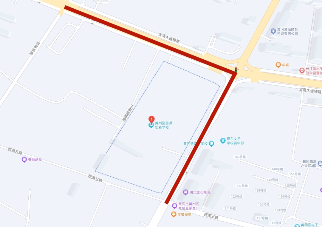 黄冈市思源学校正门前道路与新港北路交汇路口至正门前道路与赤壁一路延伸段交汇路口之间路段,禁止货车及噪音大的车辆通行,特殊情况可以通行的车辆禁止鸣笛,车辆减速慢行。学校正门前校区范围路段严禁车辆通行。