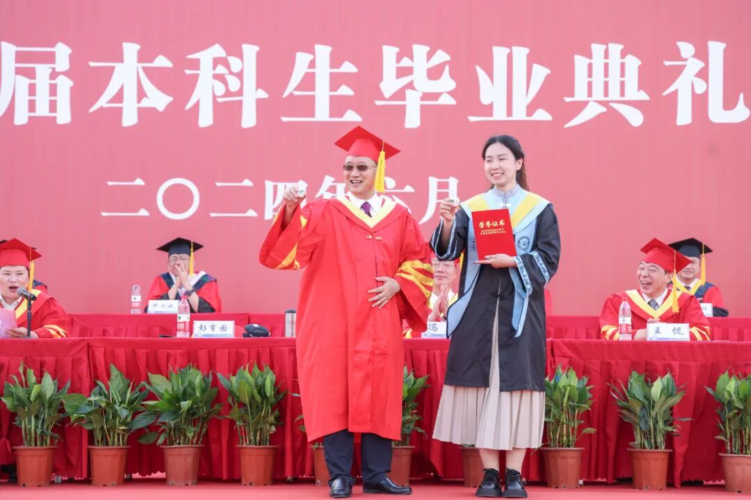 毕业典礼结束后,体育学院·国际马术学院毕业生周光桢冲上主席台与该校校长彭瑜合影。“上台拨穗的时候,我的拨穗导师不是校长,当时还有点小遗憾。趁着校长没走,我赶紧冲到台上表达了想合影的想法,彭校长也同意了。”与校长合影结束后,周光桢感到十分激动。