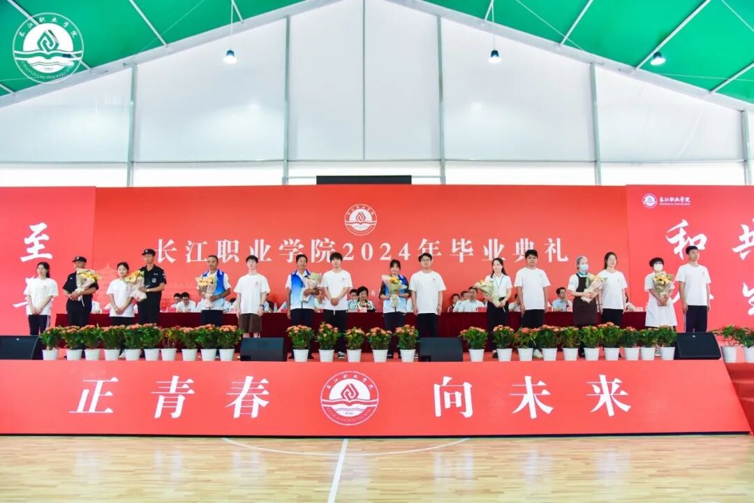 6月17日,长江职业学院2024年毕业典礼出现温情一幕。8位一线员工代表被隆重地邀请走上毕业典礼的主席台。他们之中,有食堂阿姨、宿管员、保洁员、保安、医护人员。来自不同学院的毕业生代表,向他们献上鲜花,鞠躬致谢。每一束鲜花,都代表着深深的敬意;每一声谢谢,都凝聚着真挚的感激。