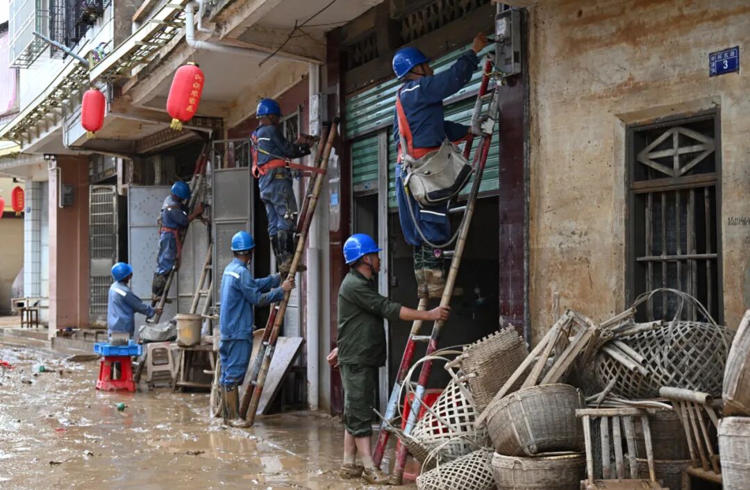 6月19日,广东梅州当地洪水已逐步退去,各方救援人员清淤泥、通水电、通道路,争分夺秒开展灾后救援。
