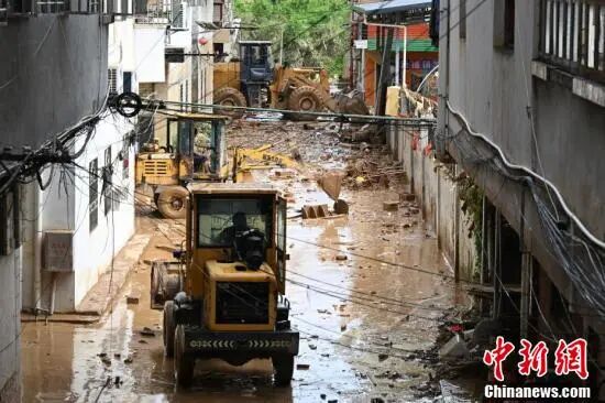 6月19日,工作人员在广东省梅州市蕉岭县福岭村清理淤泥。中新社记者 陈楚红 摄