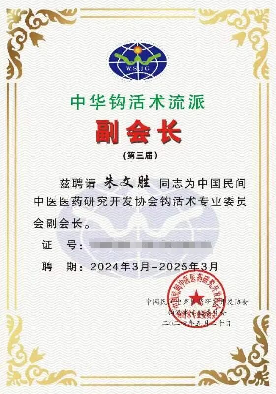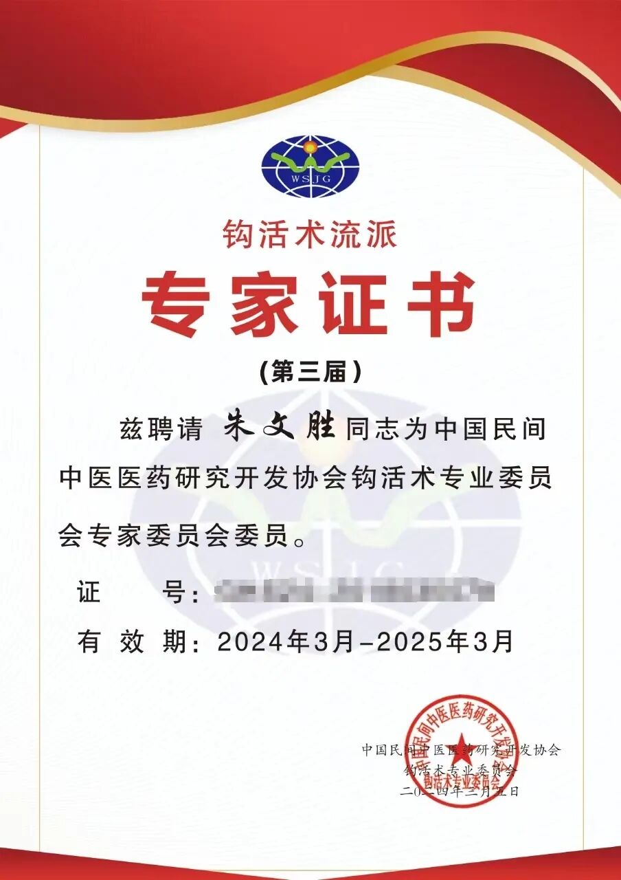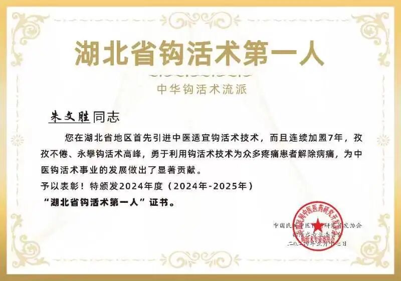 黄冈市中医医院朱文胜在湖北省地区首先引进中医适宜钩活术技术,凭借专业的理论知识、精湛的医学技艺,近日被中国民间中医医药研究开发协会钩活术专业委员会授予“湖北省钩活术第一人”的荣誉称号。