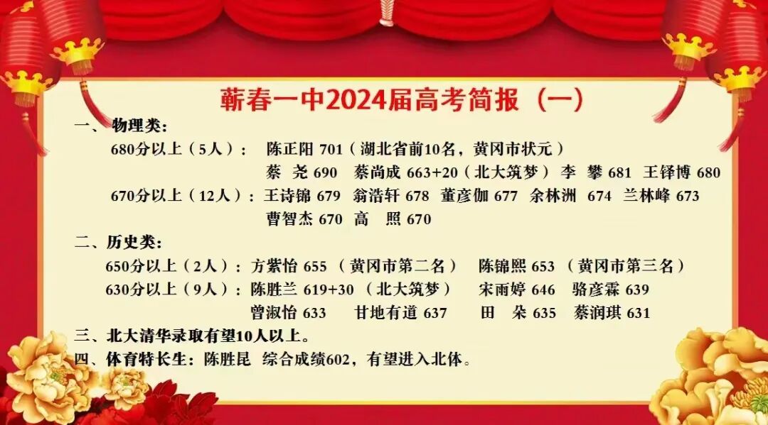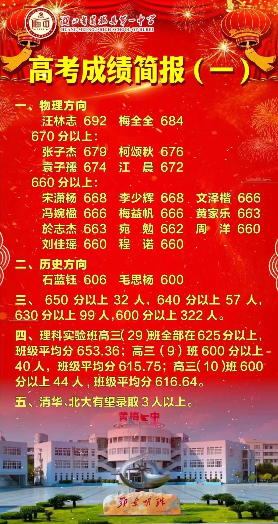 一、物理方向黄冈中学最高分697分,并列2人:高三(7)班李洺志、朱子琦均为全市第2名;历史方向最高分高三(3)班周子涵670分全市第1名,全省前10名。