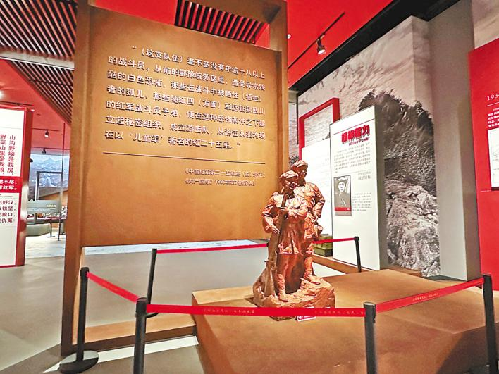 红二十五军长征集结革命历史展一角的小红军战士塑像,红二十五军以“儿童军”著名。(湖北日报全媒记者 龚雪 摄)湖北日报讯 (记者龚雪、通讯员张益游)今年是红军长征出发90周年。近日,长征国家文化公园·英山园系列展陈经过精心布展后正式亮相,全方位展示红二十五军长征出发前在英山县陶家河集结的历史,以及鄂豫皖省委、第七十五师驻扎在陶家河时的指挥、作战等方面的情况。