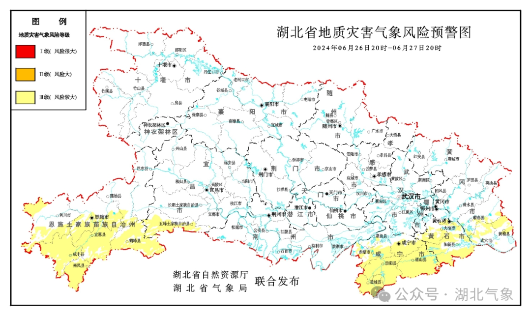 2024年6月26日20时—6月27日20时,预计咸宁地区、黄石地区,恩施(恩施市、建始南部、利川、咸丰、来凤、宣恩、鹤峰)、宜昌(五峰)、黄冈(蕲春、武穴、黄梅)以及其他强降水区域发生崩塌、滑坡、泥石流的风险较大。