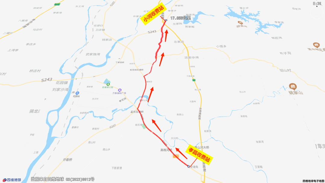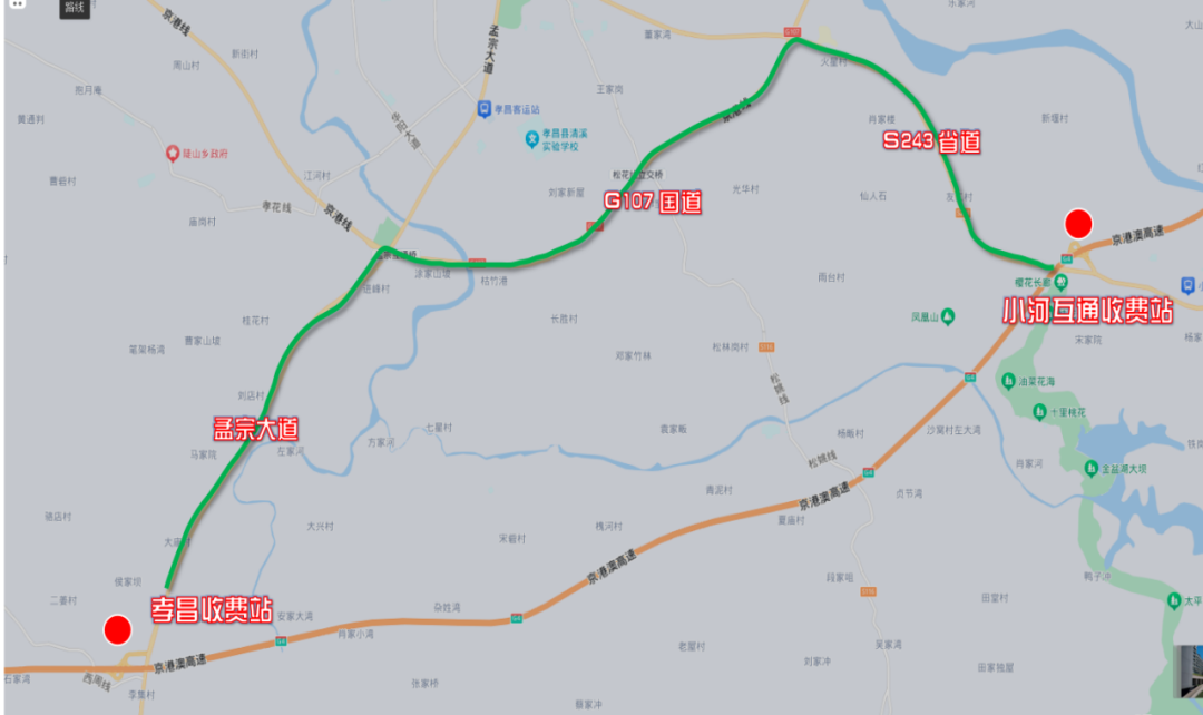 绕行路线:从小河互通收费站→S243省道→G107国道→孟宗大道→孝昌收费站