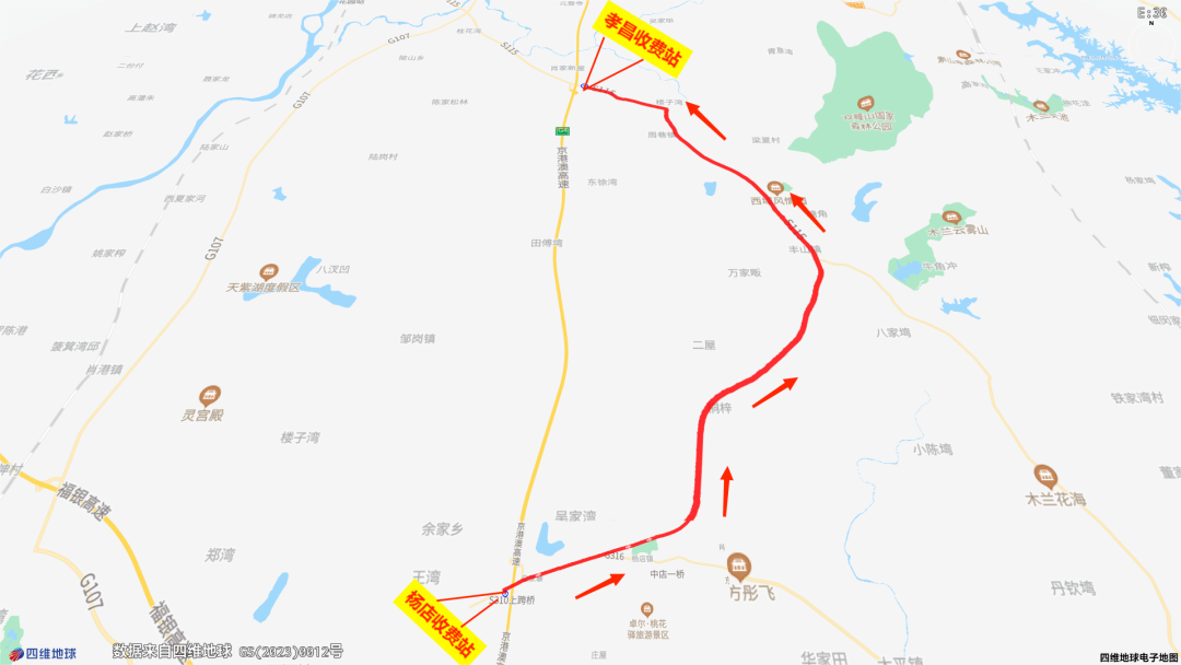 绕行线路二:杨店收费站→316国道→王杨线→135乡道→145乡道→西周线→玉龙大道→孝昌收费站