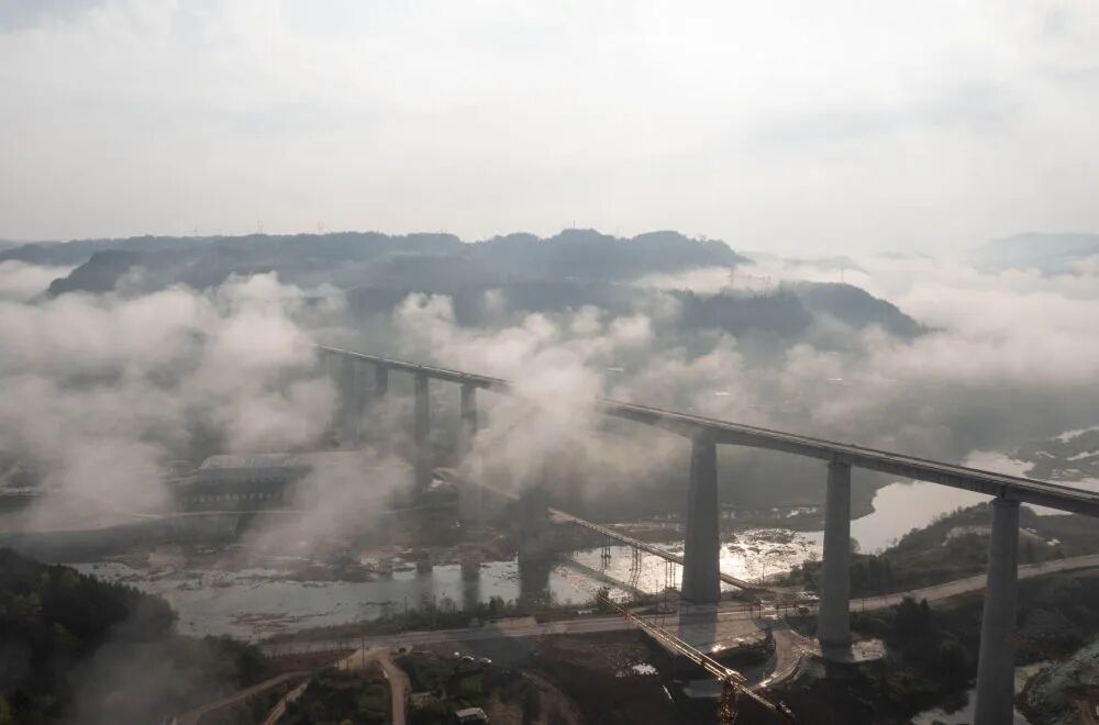 这是一条生态线。嘉陵江特大桥采用高低塔混合梁,减少山体开挖;恩阳河特大桥采用节段拼装工艺,减少桥墩个数;正线桥隧比约70%,减少耕地扰动。