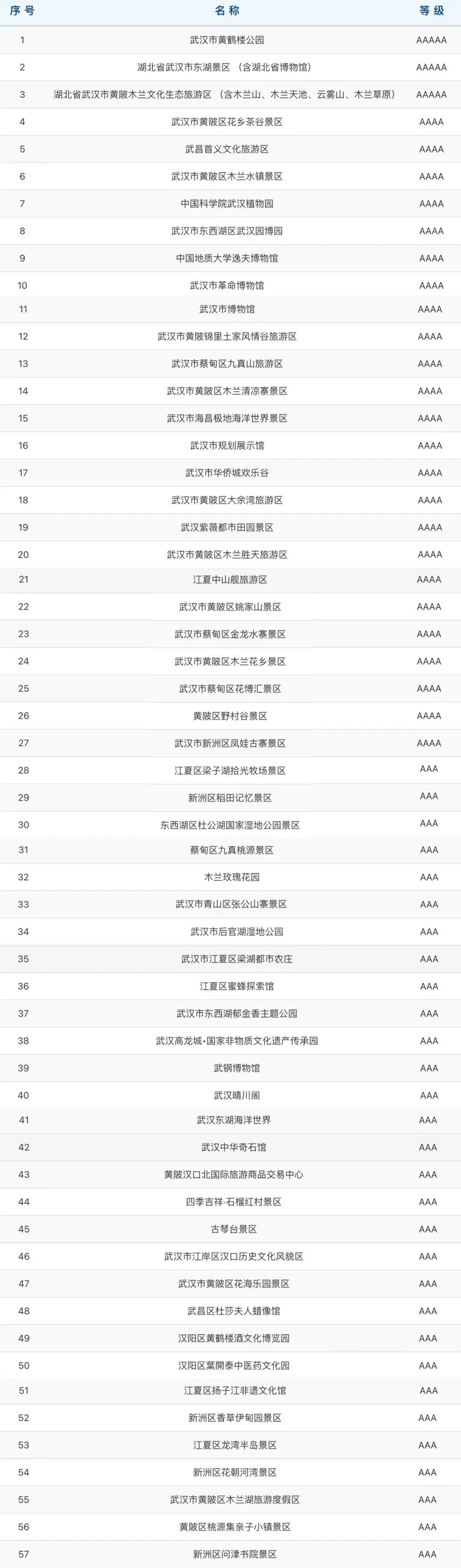 武汉57家A级景区名单(点击图片可放大查看)↓↓↓