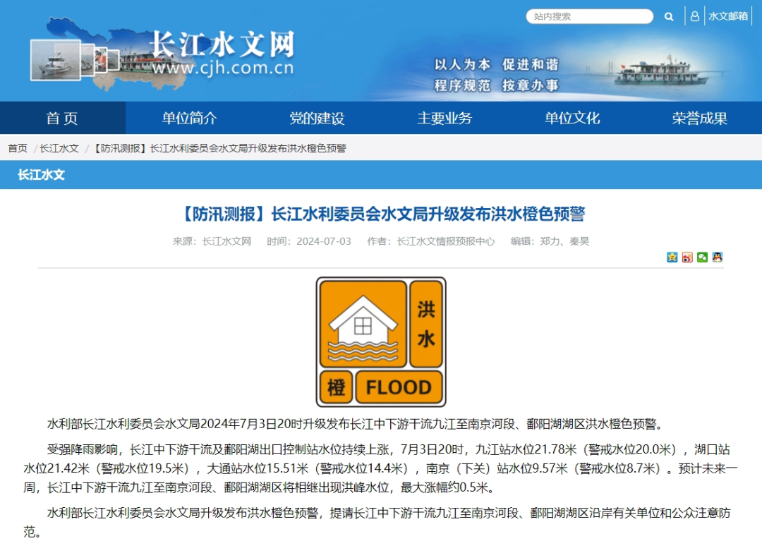 水利部长江水利委员会水文局2024年7月3日20时升级发布长江中下游干流九江至南京河段、鄱阳湖湖区洪水橙色预警。