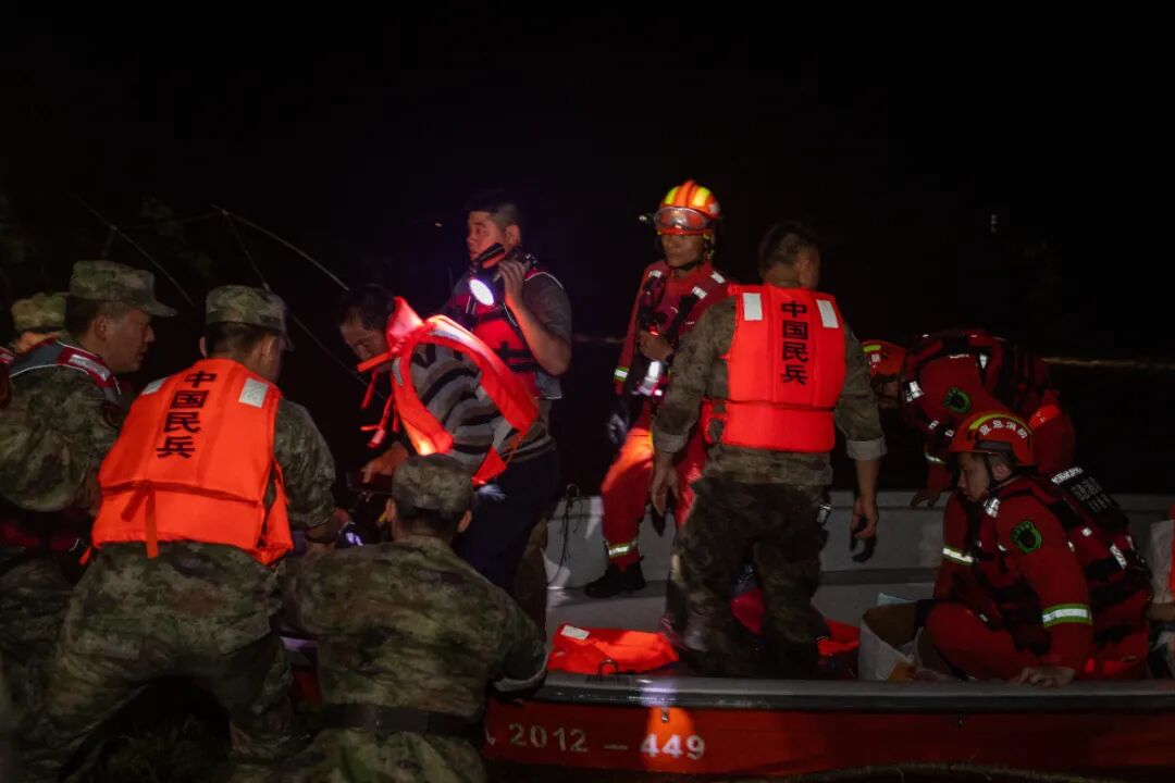 7月5日晚,岳阳军分区官兵和其他救援人员驾驶冲锋舟在溃口下游区域进行搜救。岳阳军分区供图