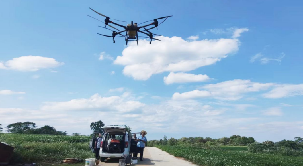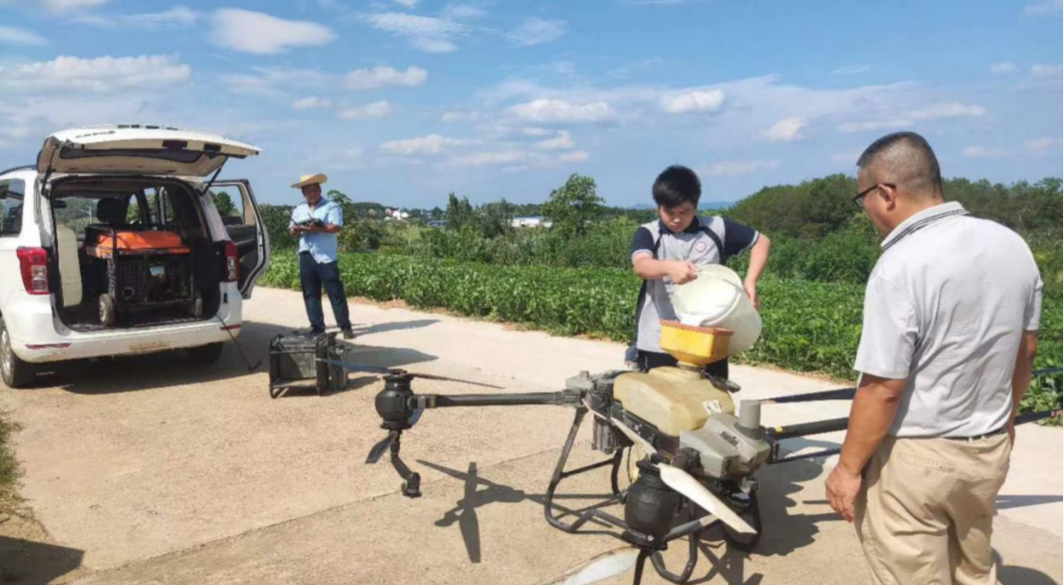 7 月 6 日下午,红安县城关镇中徐家村的上空出现了一道独特的风景线———一架无人机在熟练操作人员的操控下,按照预设的航线和喷洒剂量,穿梭自如地将药物均匀撒向受灾区域。这是城关镇林业站针对中徐家村近日出现的松毛虫灾害所采取的高效防治手段。