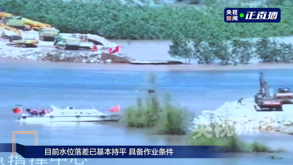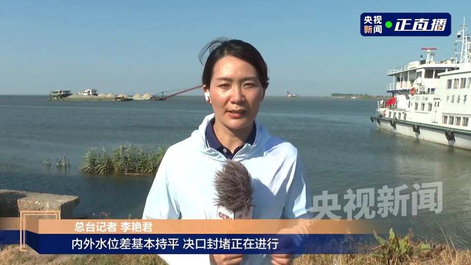 记者李艳君、王广蓉在现场介绍开展溃口封堵合龙工作的情况。两路记者分别选取封堵作业现场两端的不同角度,通过出镜、航拍、地面机位长焦、插片等形式全方位展示封堵作业全貌,传递核心现场画面,回应网友关切。