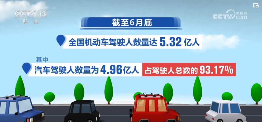 截至6月底,全国机动车驾驶人数量达5.32亿人。其中,汽车驾驶人数量为4.96亿人,占驾驶人总数的93.17%。